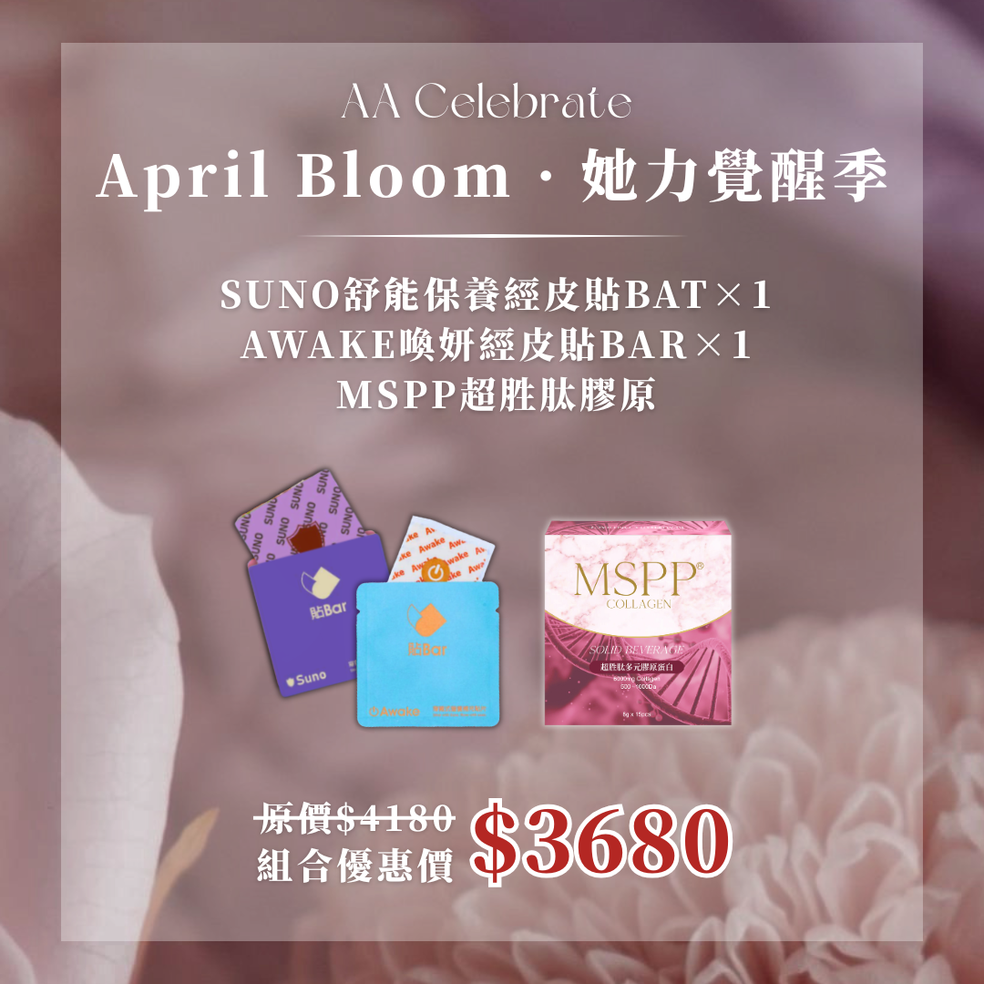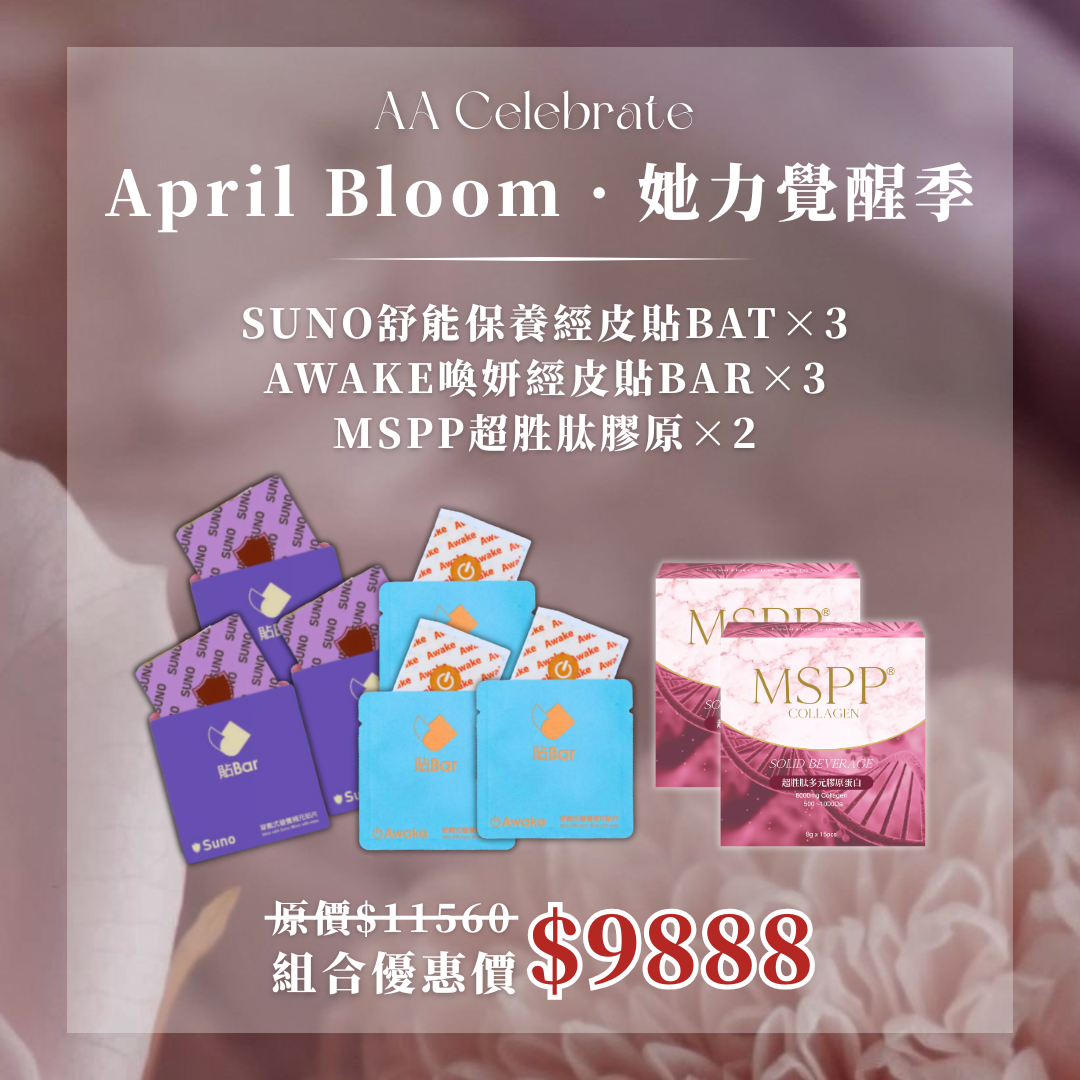 1️⃣MSPP超胜肽膠原×1+SUNO舒能保養經皮貼BAT×1+AWAKE喚妍經皮貼BAR×1